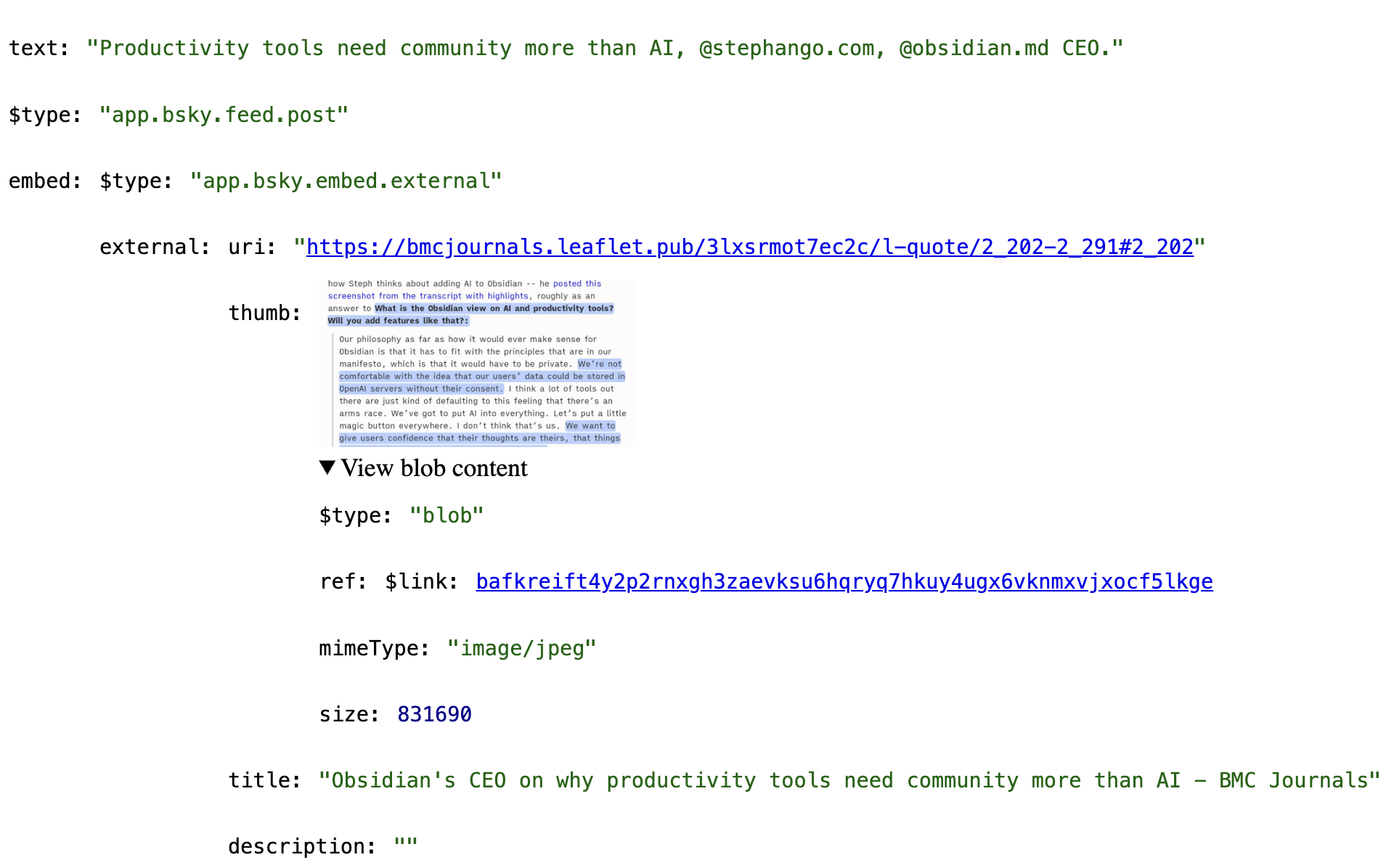 Here's a "prototype" of what Cosmik Network's Semble bookmarking tool might look like when shared to bsky -- rich text link, description, comment, and permalink back to the Semble appview.